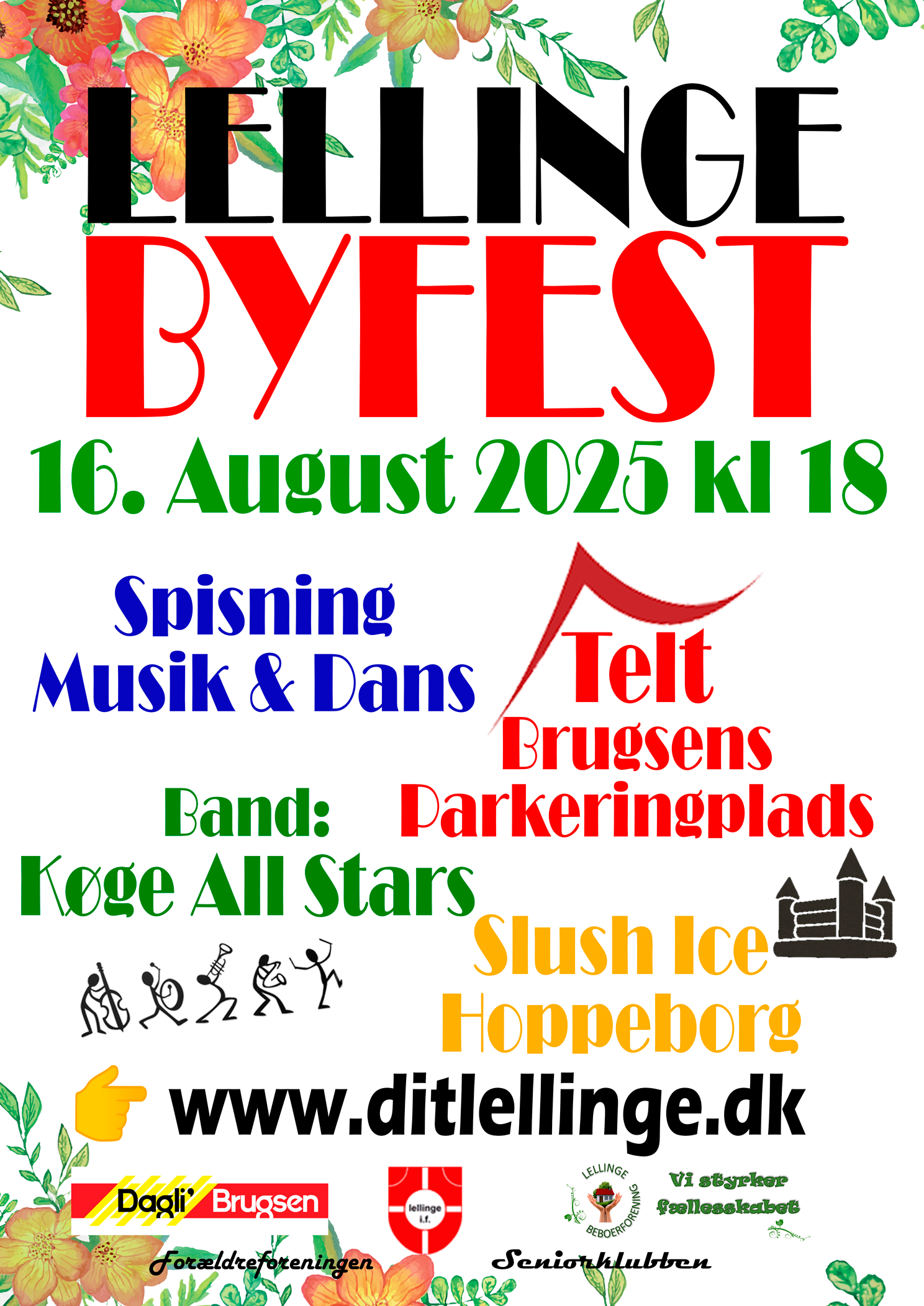 Beboerforeningen, Brugsen, Lellinge Idrætsforening, Seniorklubben og Forældreforeningen invitere til Byfest d. 16 august 2025.