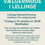 Vi håber at se rigtig mange Lellinge-borgere til vælgermødet, hvor vi går tæt på politikerne om deres syn på Lellinge. Der bliver rig mulighed for at stille spørgsmål.