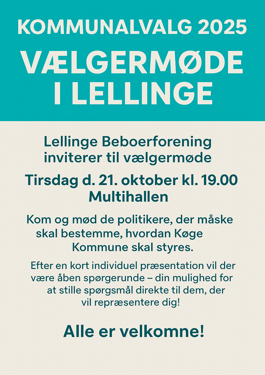 Beboerforeningen holder vælgermøde op til kommunalvalget. Vælgermødet holdes tirsdag den 7. november kl. 19.00-21.00 på Lellinge Skole i gymnastiksalen. Alle er velkommen.